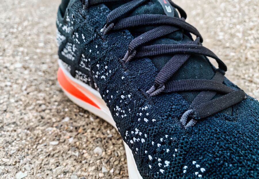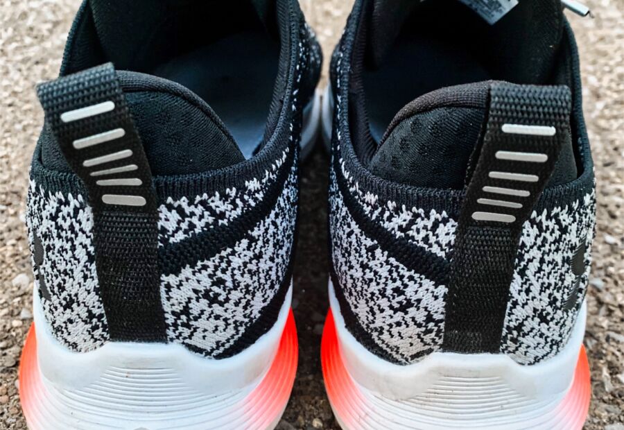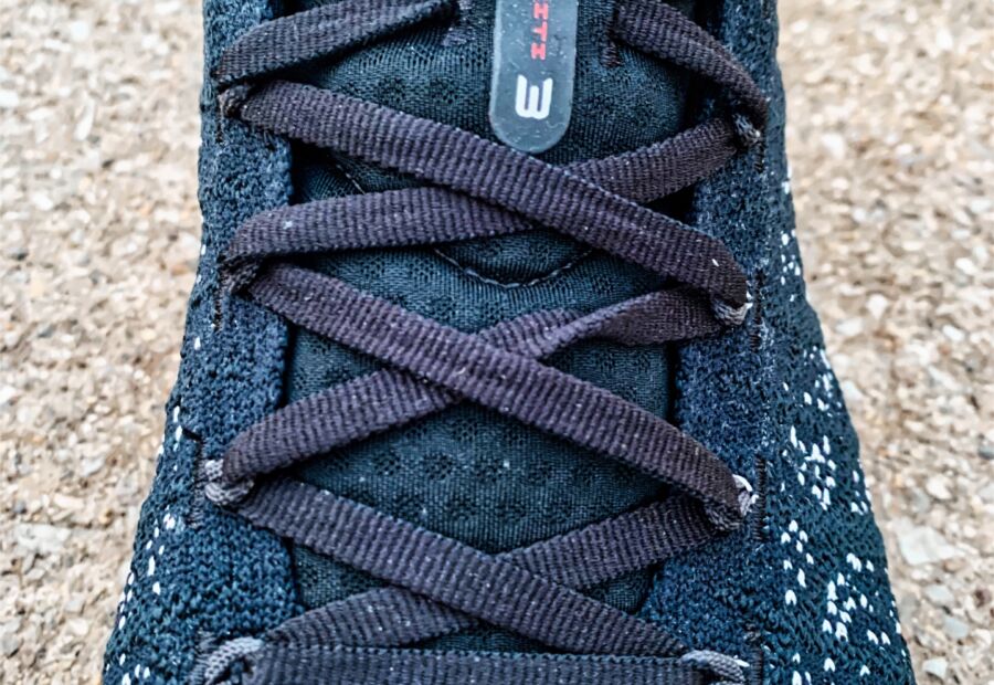 A single piece, flexible knit material is used in the latest version as UA decided to move away from the WARP technology. WARP was a thinner, nylon material with “tape’ overlays across the shoe that was designed to secure your foot and prevent unwanted movement. I didn’t have any issues with movement in the knit material and really liked the black and gray speckled design.
